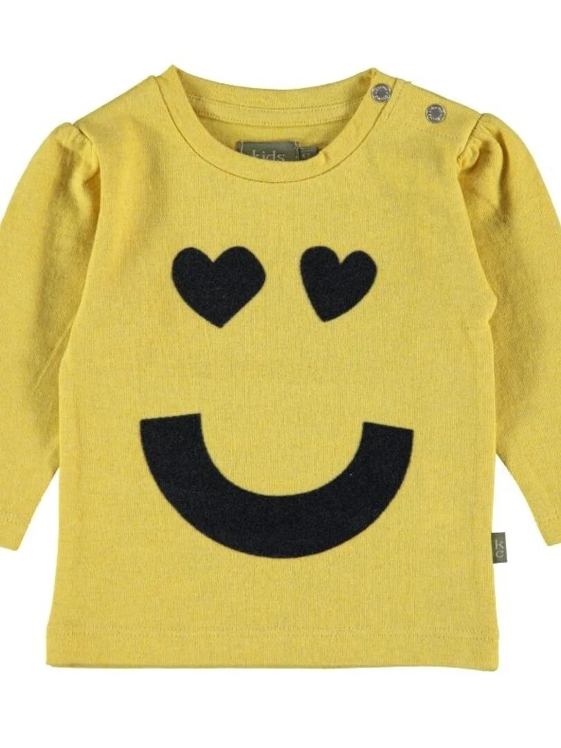 Un joli T-Shirt à manches longues 100% coton bio, doux et souple. On craque pour le motif gris « sourire » en feutrine et les petits yeux en forme de coeur, collés sur le T-Shirt.